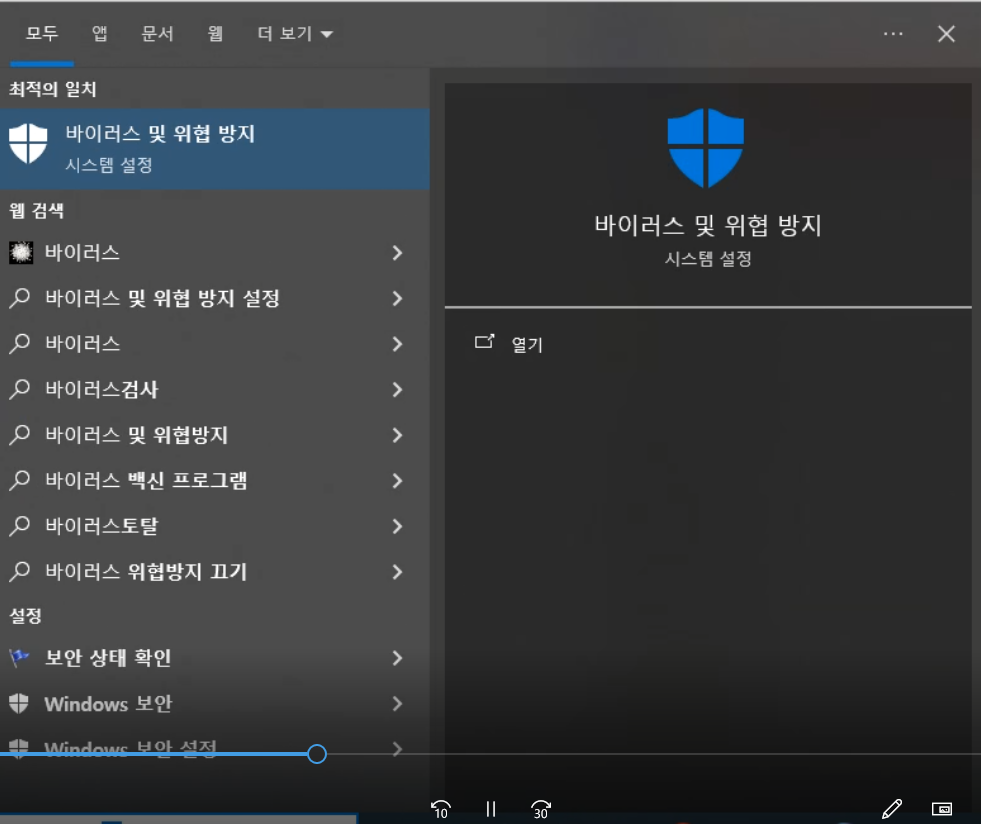 1. 시작누르고 바이러스 쳐서 바이러스 및 위협방지 들어감.